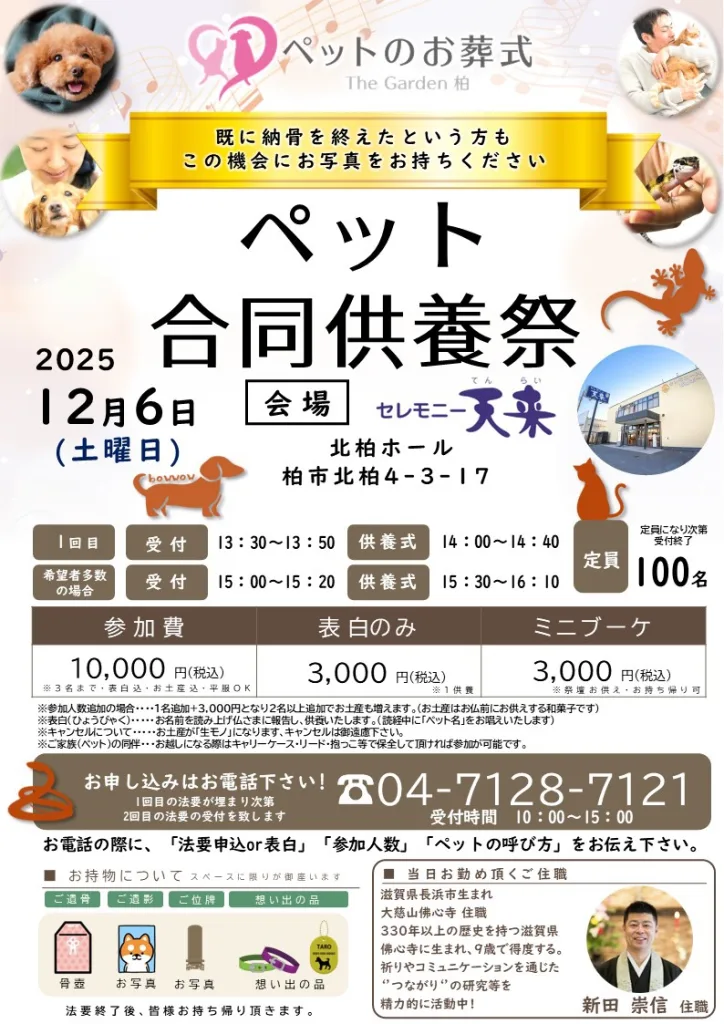 この度、大切なご家族であるペットちゃんたちの合同供養祭を佛心寺のご住職を招いて開催することが決定致しました!